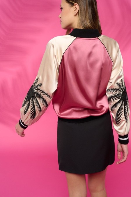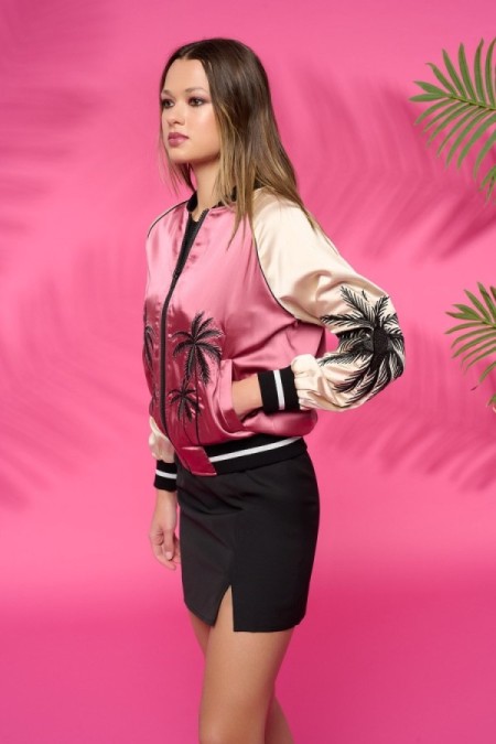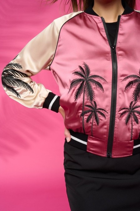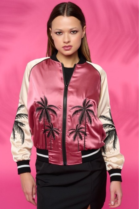 Chaqueta estilo bomber de cuello redondo y manga larga. Tejido satinado. Bordado de palmeras. Cierre frontal con cremallera. Cintura y mangas elásticas en rib.
