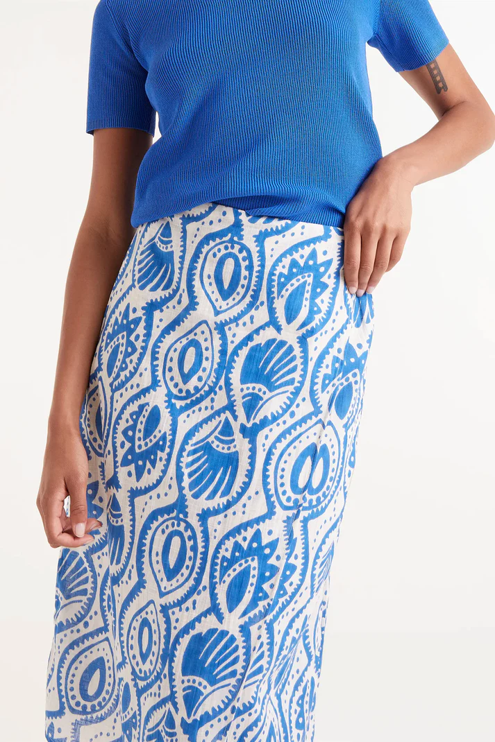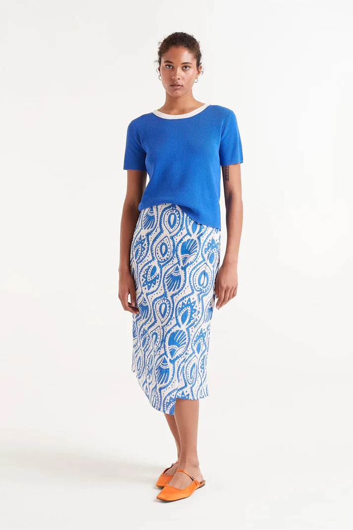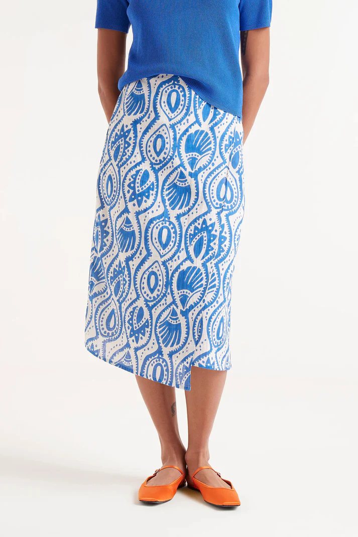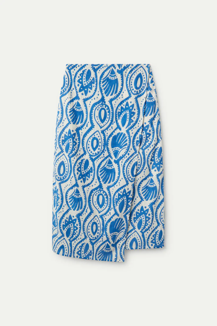 Falda midi en algodón con estampado Aquaria. Con cintura fija de tiro medio. Modelo cruzado frontal.