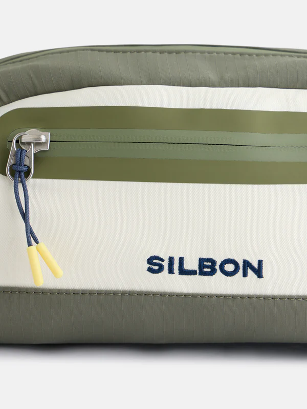 Neceser sport confeccionado en tejido técnico. Presenta cierre de cremallera con tiradores personalizados, bolsillo exterior y forro personalizado. Cuenta con detalle de raquetas y letras Silbon bordadas. Contiene etiqueta interior personalizada.