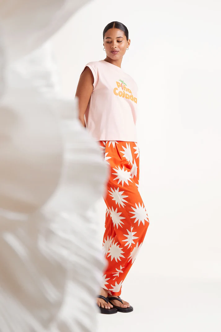 Pantalón largo con estampado Big Sun. Con cintura fija frontal y elástica trasera de tiro medio y pernera de corte recto. Bolsillos laterales.