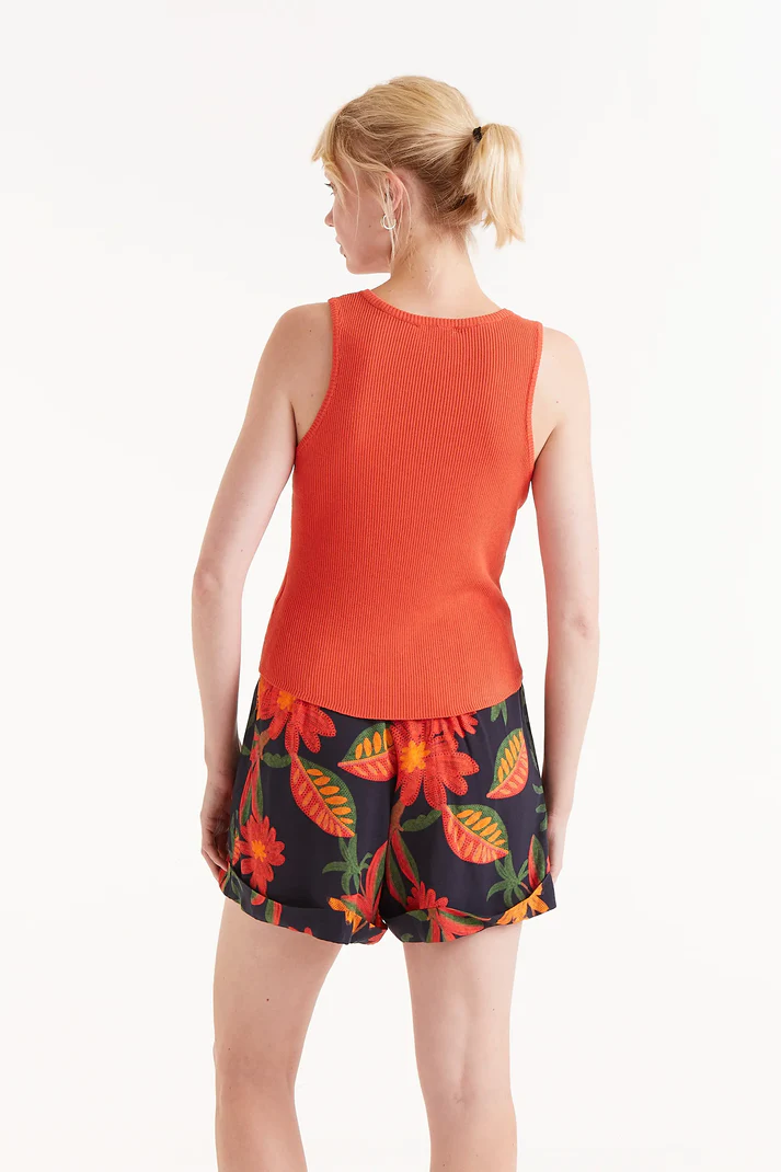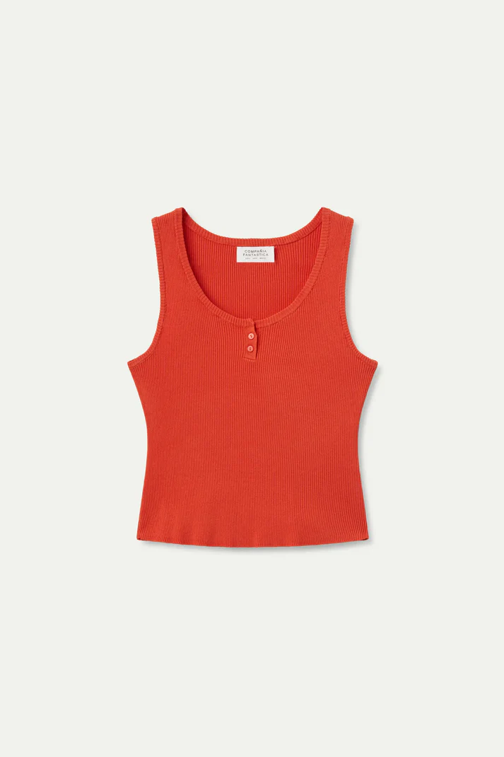 Top punto fino de color naranja. Con cuello redondo y sin mangas. Detalle de botones en el pecho.