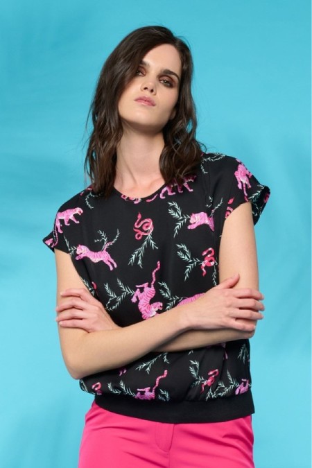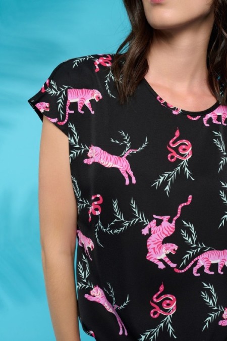 Camiseta de cuello redondo y manga corta. Cinturilla elástica en bajo. Estampado «Vuelo Fidji» de la Colección cápsula «Love Music».