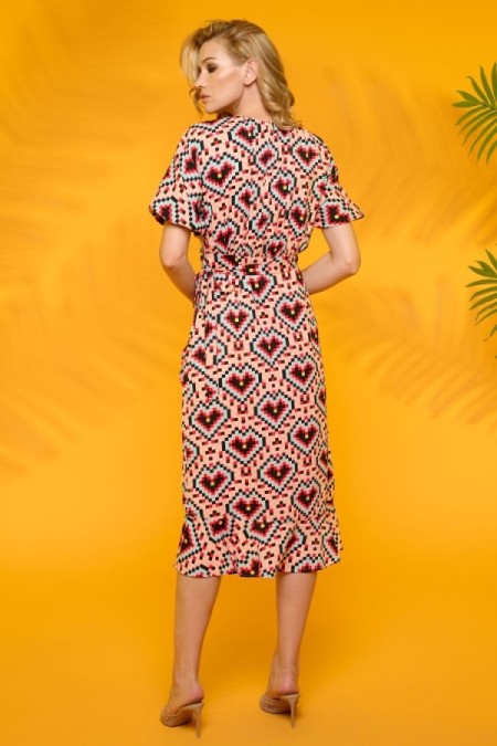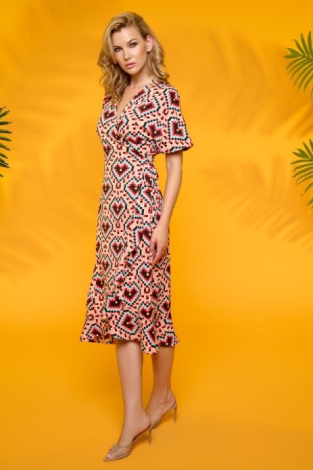 Vestido midi de escote en pico y manga corta mariposa. Cintura ajustable con lazadas. Estampado pixel. Forro interior.
