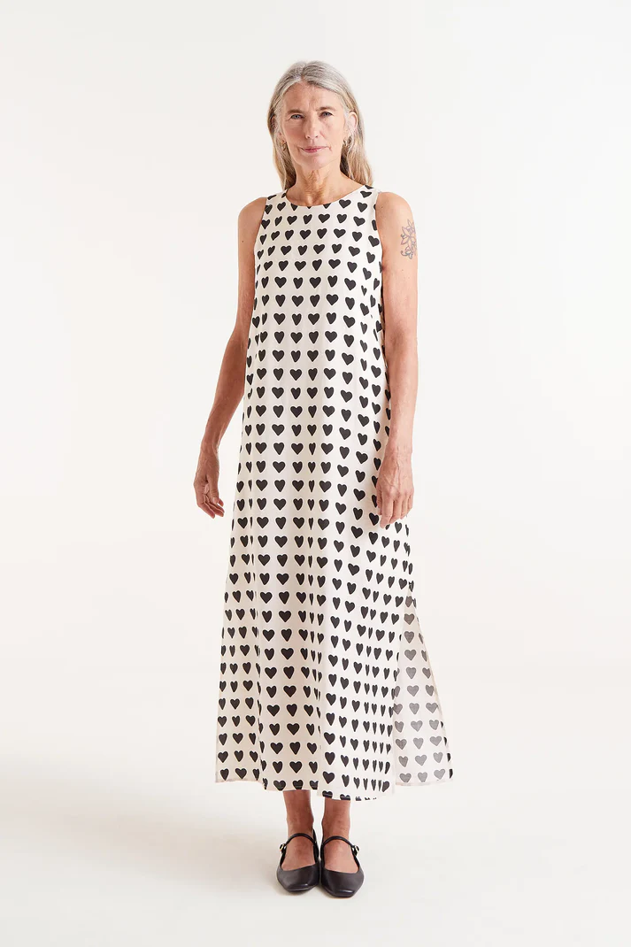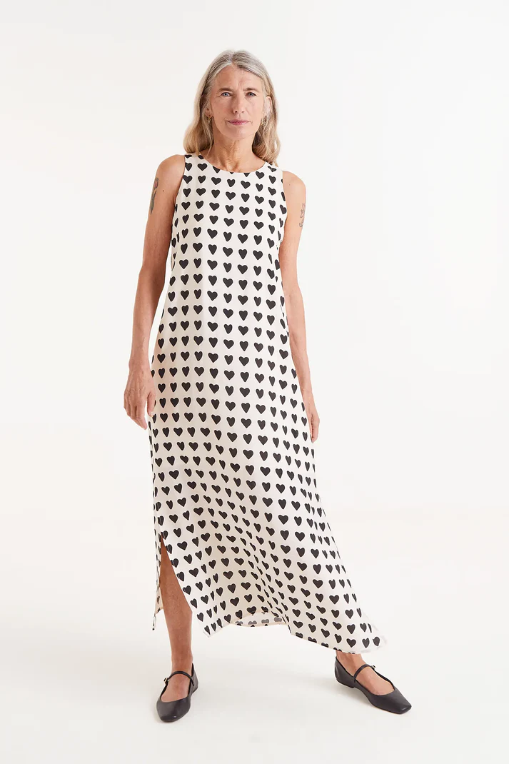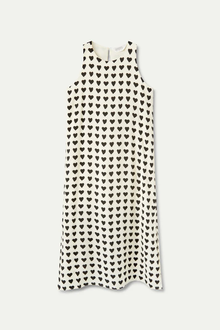 Vestido largo fluido en crepe ligero con estampado de corazones. Con cuello redondo y sin mangas. Cierre trasero con abertura y botón. Detalle de aberturas laterales.