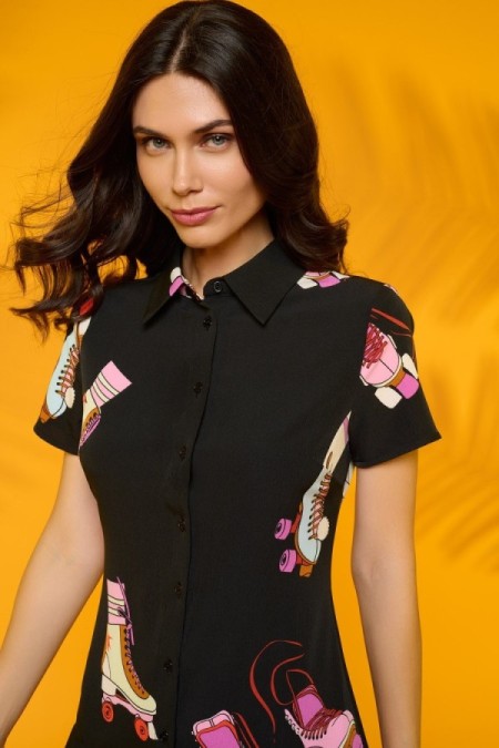 Vestido corto camisero de manga corta. Bajo plisado. Cierre con botones frontales.