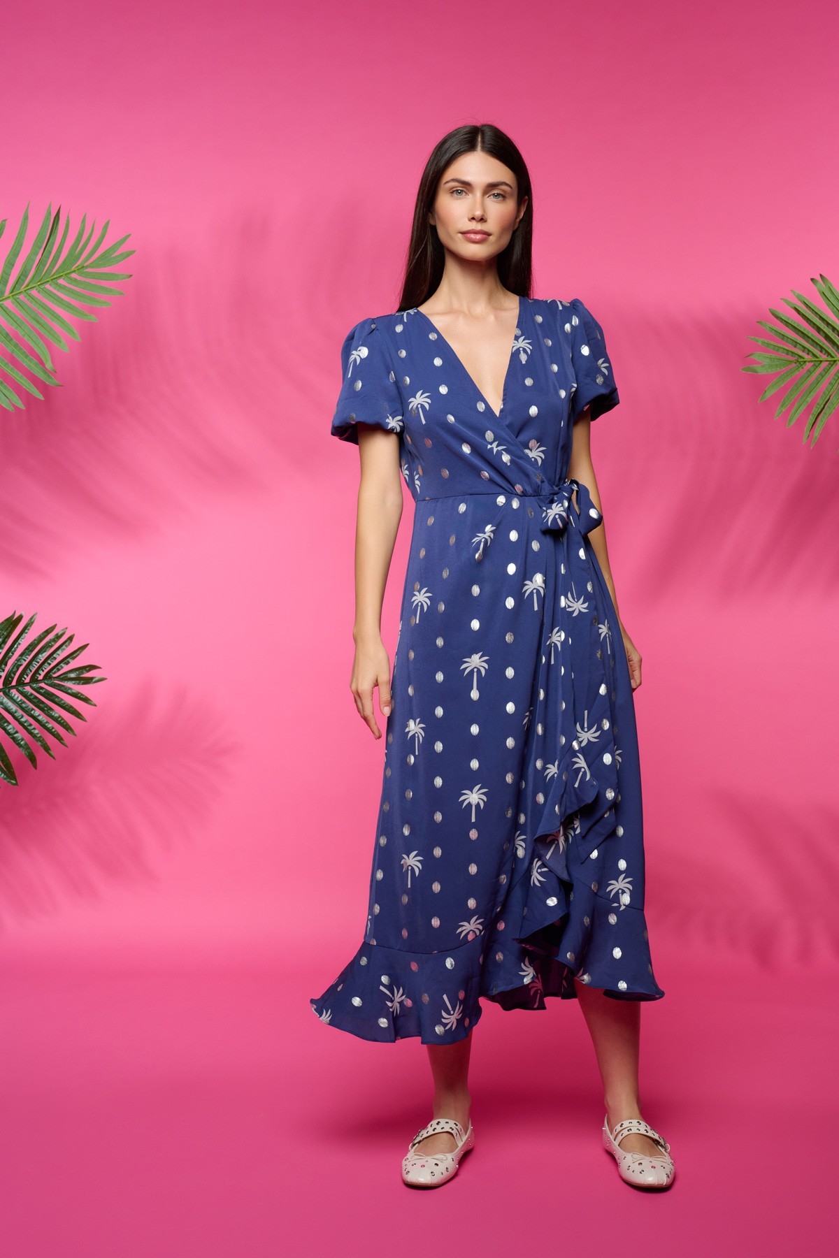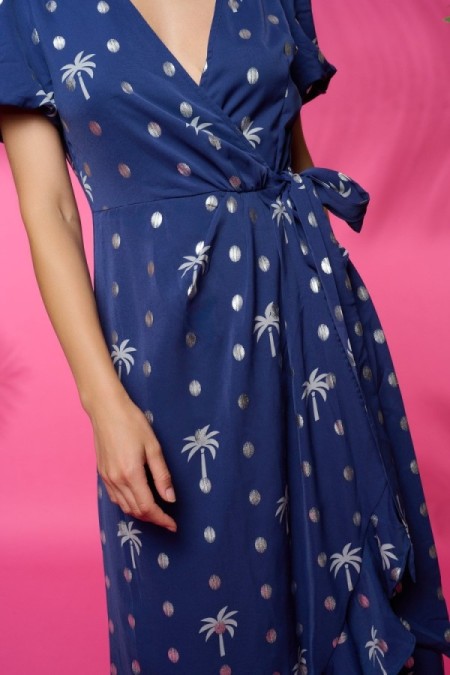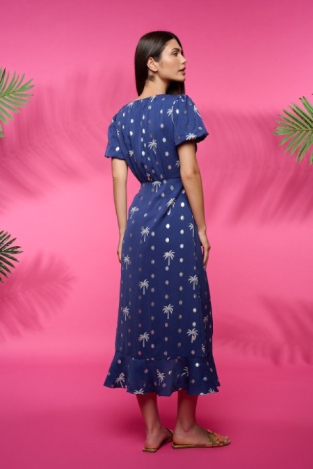 Vestido midi de escote en pico y manga corta. Cintura ajustable con lazada. Estampado metalizado. Forro 100% algodón.